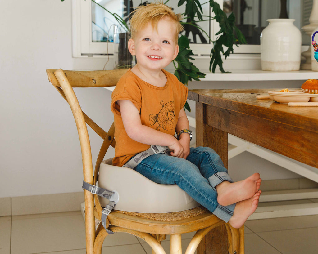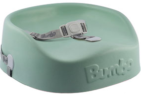 Bumbo® polyurethane foam booster seat with 3-point harness and chair attachment straps