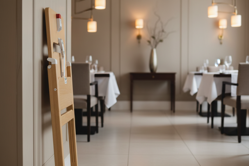 Folding beechwood high chair , designed for intensive use in community or professional settings (ERP).