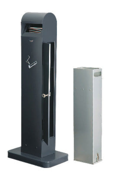 Le bac intérieur de grande capacité permet une évacuation facile par trappe latérale, sans levage, tout en offrant un entonnoir de capture des mégots et plaque inox d’écrasement accessible des deux côtés, pour un usage optimisé et sécurisé.