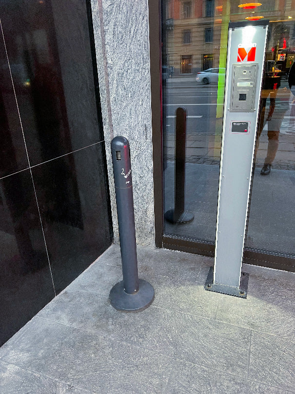 - Kit de fixation au sol et matériel de montage inclus, clé de verrouillage et plaque d’écrasement mégots en inox.